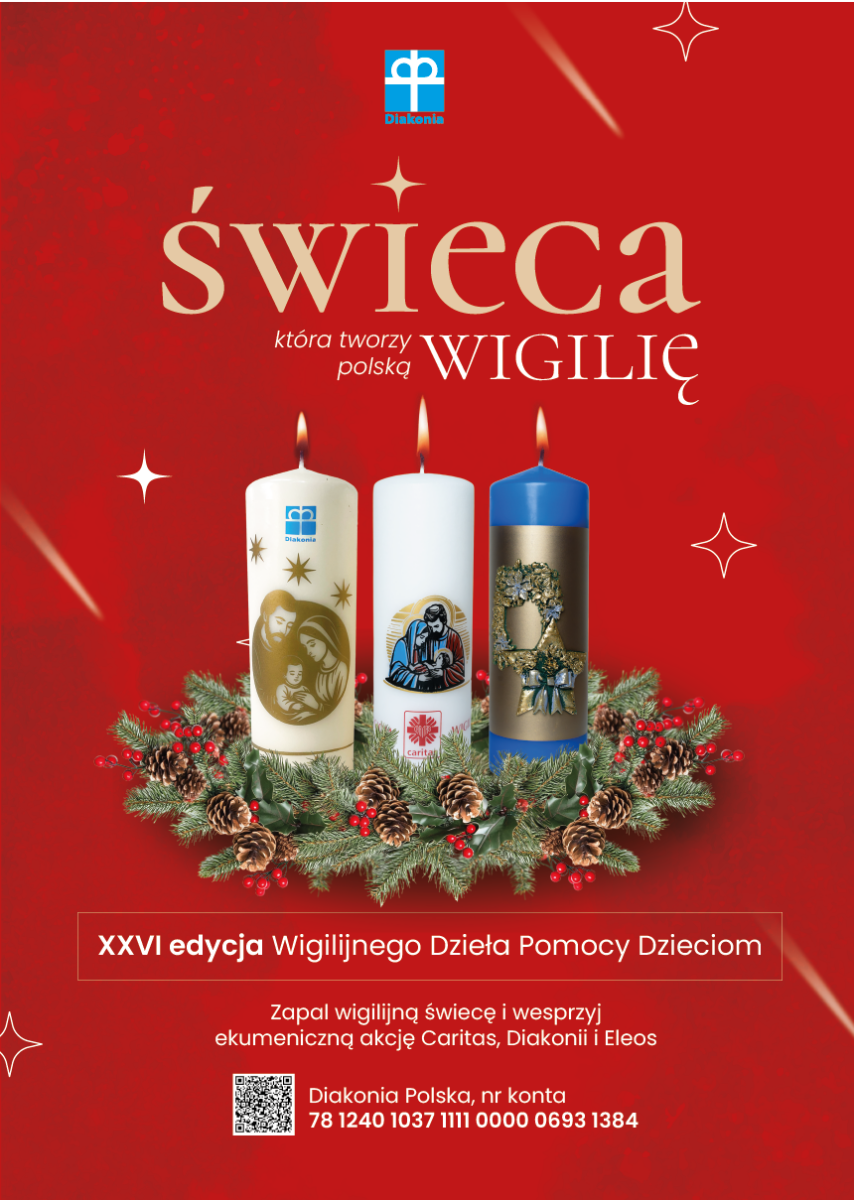 Wraz z początkiem adwentu rozpoczyna się doroczna akcja charytatywna Wigilijne Dzieło Pomocy Dzieciom. Prowadzona jest wspólnie przez kościelne organizacje charytatywne: Caritas Kościoła Rzymskokatolickiego, Diakonię Kościoła Ewangelicko-Augsburskiego (Diakonię Polską) oraz Eleos Kościoła Prawosławnego. W ramach tej ekumenicznej inicjatywy Diakonia Polska rozprowadzi w tym roku około 9 tys. świec. Pozyskane w ten sposób fundusze zostaną przeznaczone na pomoc potrzebującym dzieciom.